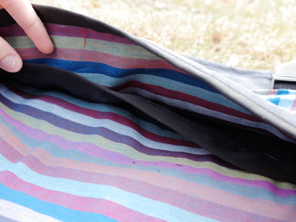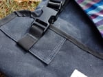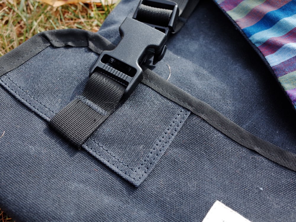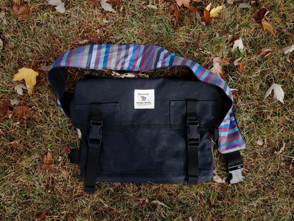 14oz waxed duck messenger bag in obsidian. with striped cotton liner. Fabric strap over shoulder, 3 point attachment around the hip, and an additional laptop sleeve inside the bag. 13” wide. Very soft but functional, great for everyday use.